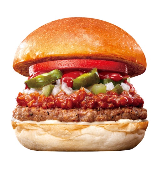 商品概要:牛肉100%のパティに、ごろごろと具材が入ったボロネーゼを合わせ、ピリッとした辛さが特長のハラペーニョ、唐辛子の辛みとニンニクの旨み、ビネガーの酸味のバランスが絶妙な特製旨辛ソース、玉ねぎとピクルスのレリッシュ、トマトなどとともにふんわりもっちり食感のバンズで挟みました。ボロネーゼとスパイシーな風味が特長の特製旨辛ソースがクセになる味わいです。
