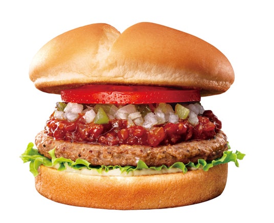 商品概要:ごろごろと具材が入ったボロネーゼを牛肉100%パティに合わせ、玉ねぎとピクルスのレリッシュ、トマト、レタスなどとともにふっくらなめらかな食感のバンズで挟みました。シンプルにボロネーゼの味わいを楽しめる一品です。