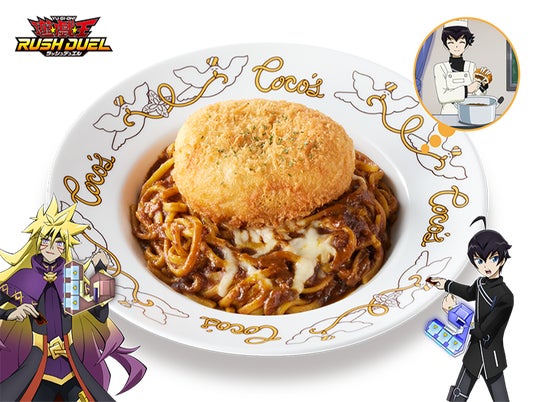 『遊☆戯☆王ゴーラッシュ!!』の作中に出てくるカレーパスタを再現しました。店内で揚げたカレーパンをのせ、ココス風にアレンジしています。パスタは、カレーソースと相性がよい低糖質の平打ちパスタ“タリオリーニ”を使用。カレーパンの下に隠れた温泉玉子とチーズをカレーパスタと混ぜるとまろやかな味わいへの変化をお楽しみいただけます。