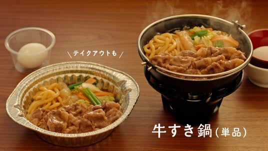 すき家では10月31日(木)より、「牛すき鍋定食」を販売しています。特製の割り下がしみ込んだ白菜や白滝、柔らかなお肉など、たっぷりの具材をご堪能いただける一品です。