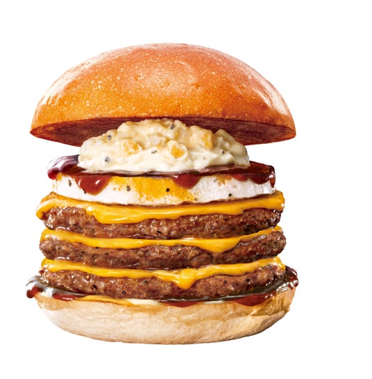 商品概要:牛肉100%パティとレッドチェダーチーズを贅沢に3枚ずつ重ね、店内で焼いたぷるぷる食感のたまご、特製タルタルソース、特製てりやきソースなどとともにふんわりもっちり食感のバンズで挟みました。