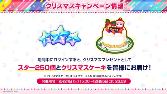 12月24日(火)15時から12月25日(水)23時59分までの期間中にログインすることで、クリスマスプレゼントとして「スター250個」と「クリスマスケーキ(ライブブースト10回復)」を受け取ることができます。