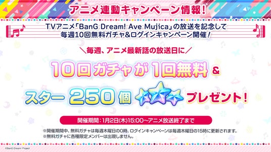 1. 「TVアニメ「BanG Dream! Ave Mujica」放送カウントダウンログインキャンペーン!」開催決定!