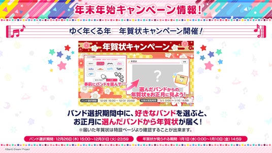 12月26日(木)15時から12月31日(火)23時59分までのバンド選択期間中に好きなバンドを選ぶと、1月1日(水)より選んだバンドから年賀状を受け取ることができます。