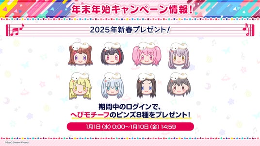 1月1日(水)0時から1月10日(金)14時59分までの期間中にログインすることで、2025年の干支である「へび」をモチーフにした全8種の「お正月ピンズ」をプレゼントいたします。