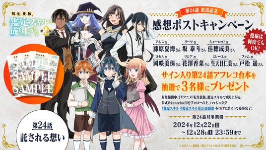TVアニメ『転生貴族、鑑定スキルで成り上がる 第2期』第24話(第2期12話目)放送を記念して、アルス役 藤原夏海さん、リーツ役 坂 泰斗さん、シャーロット役 佳穂成美さん、ロセル役 岡咲美保さん、リシア役 花澤香菜さん、ミレーユ役 生天目仁美さん、ファム役 戸松 遥さんのサイン入り第24話台本を、3名様にプレゼントいたします。