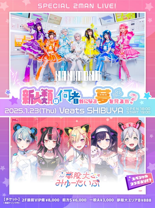 2025年1月23日(木)にVeats Shibuyaにて、NANIMONO×夢限大みゅーたいぷ 対バンLIVE 「新人類は何者かになる夢を見るか?」が開催されます。 現在チケットが一般発売中です。