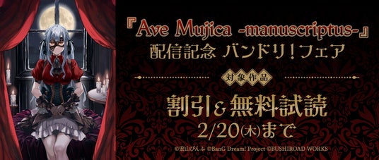 株式会社ブシロード(本社:東京都中野区、代表取締役社長:木谷高明、以下ブシロード)のグループ会社にあたる株式会社ブシロードワークス(本社:東京都中野区、代表取締役社長:新福恭平)は、絶賛放送中のTVアニメ「BanG Dream! Ave Mujica」のコミカライズ『BanG Dream! Ave Mujica -manuscriptus-』第1巻が本日2月7日(金)に発売したことをご案内いたします。また、発売を記念した電子書籍フェアも実施中です。
