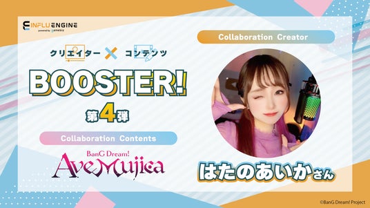 株式会社ブシロード (本社:東京都中野区、代表取締役社長:木谷高明)のグループ会社にあたる株式会社ゲームビズ(本社:東京都中野区、代表取締役社長:大貫佑介)は、インフルエンサーコラボレーションサービス「INFLU ENGINE(インフルエンジン)」で開催中のコラボ企画「クリエイター×コンテンツBOOSTER!!」にて人気インフルエンサー「はたのあいか」とコラボいたしました。報道関係の皆様におかれましては、ぜひ本情報をお取り扱いいただきますよう、お願い申し上げます。