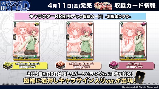 株式会社ブシロード(本社:東京都中野区、代表取締役社長:木谷高明)は、4月11日(金)にカードファイト!! ヴァンガードよりMasterDeckset「羽根山 ウララ」、MasterDeckset「羽根山 ウララ」を発売することをお知らせいたします。