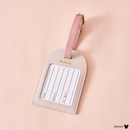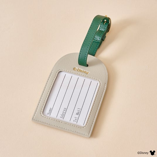 ネームプレートをイメージしたチャームは「ミッキーマウス」と愛犬「プルート」がリラックスしているアートをプリント。くすみカラーを使用しているので、大人っぽい印象に。