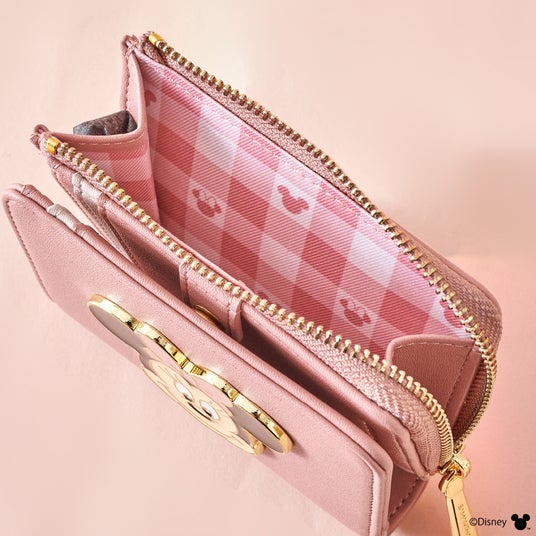 裏地は「ミッキーマウス」「ミニーマウス」のシルエットと、ギンガムチェックのデザインがポイントになっており、お財布の中までこだわったアイテム。