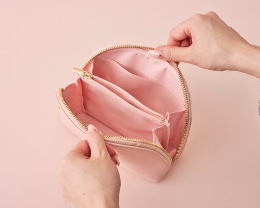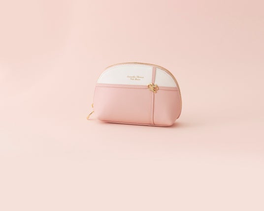 ギフトボックスをイメージしたキュートなシリーズのポーチは、コロンっとしたシルエットにリボンの金具が可愛らしいデザイン。使い勝手の良い人気の仕様で、中央のファスナーポケットには、アクセサリーなど細かいアイテムも収納可能。半円のファスナーで大きく開くので、収納したアイテムの出し入れもしやすい、使い手に優しいデザイン。