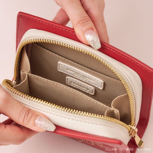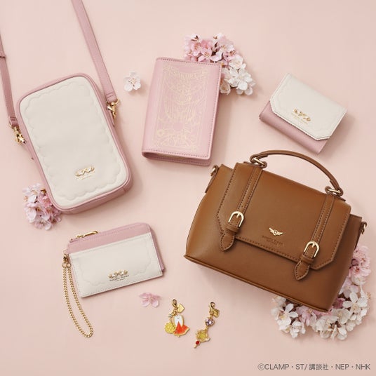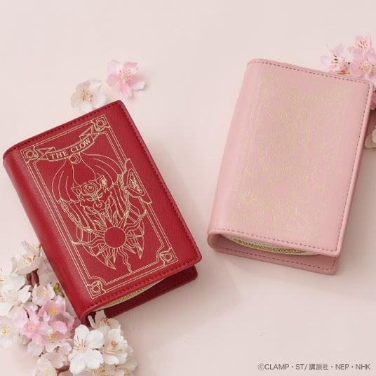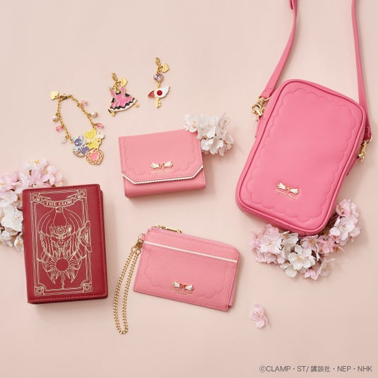 「クロウカード編」に登場するさくらちゃんの代表的なコスチュームであるピンクの衣装をモチーフにしたフラグメントケース、折財布、スマホショルダーバッグと、クロウカードブックをイメージしたポーチも。