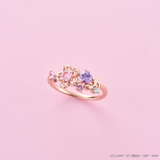さくらちゃんと知世ちゃんのふたりをイメージしたリング。桜のお花モチーフとさくら色のストーンでさくらちゃんを、音符モチーフは知世ちゃんの美しい歌声をイメージ。