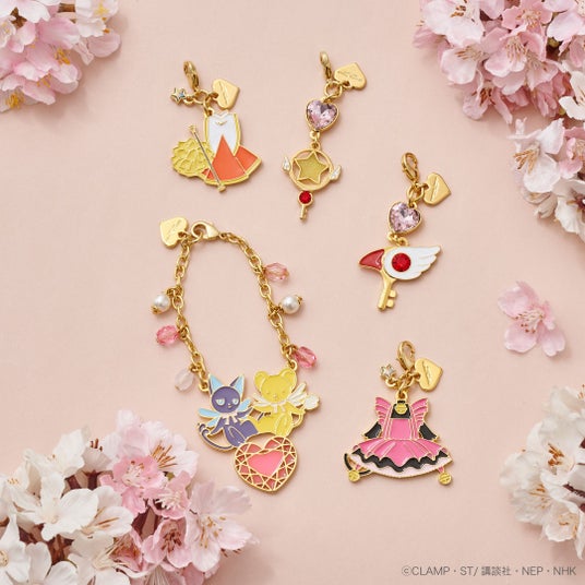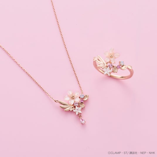 主人公さくらちゃんをイメージしたネックレス、リング。桜のお花をメインに、ピンクのストーンと花びらで舞っている様子を再現。ネックレスのモチーフにも揺れるストーンをセッティング。