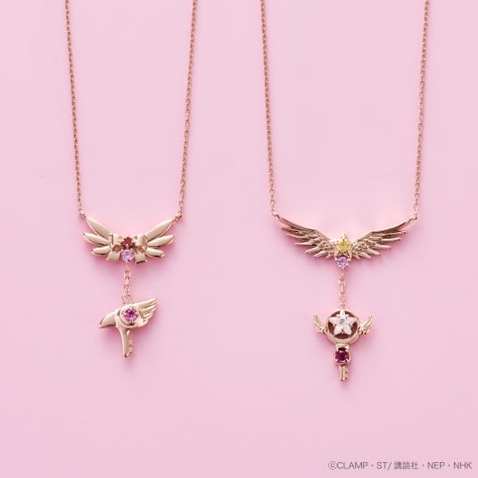 鍵の細部まで表現した封印の鍵、星の鍵のネックレス。「クロウカード編」「さくらカード編」のオープニングのさくらちゃんの衣装をイメージしたモチーフを配置。その下に鍵モチーフを合わせて、ピンクのスト-ンがアクセントに。羽の立体感もこだわりのポイント。ネックレスのエンドパーツには星をトッピングした、「カードキャプターさくら」の世界観満載のネックレス。