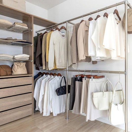 天井が高い空間では、3段パイプで大容量の収納力を確保し、空間に応じてL型のプランニングが可能になりました。シーズンオフの衣類もまとめて収納できるため、季節に合わせた衣替えの手間を省き、快適な生活空間が実現できます。