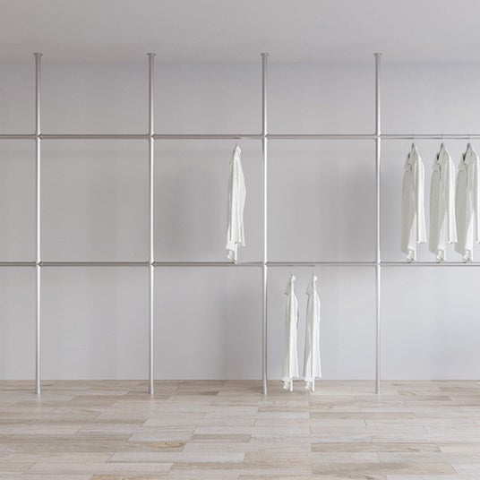 パイプシステム収納専用品として強度をアップしたパイプを新開発し、床-背壁固定プランに加え、新たに床-天井固定プランを実現しました。