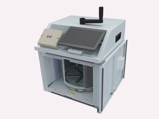 本製品はボックス内にアンテナを複数枚組込み、正面の扉を閉めた状態で、手動で回転させ読み取りを行います。対象物を回転させることで、アンテナから発する電波があらゆる角度で対象物にあたるため、アルミ製パウチなどの素材のICタグやICタグの重なりによる電波の阻害を抑制し、小電力でも高出力タイプリーダに劣らない読み取り能力を可能にしました。