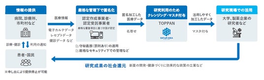 TOPPANホールディングスはアカデミア・医療機関向け「DATuM IDEA(R)」の提供を通し、大学や医療機関における研究者などを中心に利活用を進めていきます。また、電子カルテデータだけでなくレセプト(診療報酬明細書)や健康診断データなども取り扱うことで、患者が疾患を認識してから診断/治療/その後の生活に至るまでの流れを明らかにした統合データベースの構築を目指します。