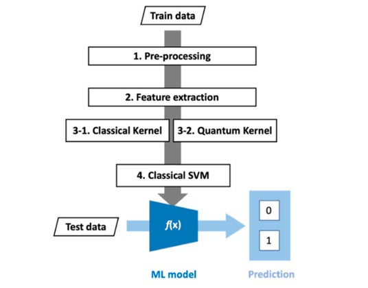 図1:古典カーネルと量子カーネル法を用いた検査プロセスの流れ。図中の3.2は古典カーネルの代わりに量子カーネル埋込むことで従来のSVMによる機械学習を実施できる。