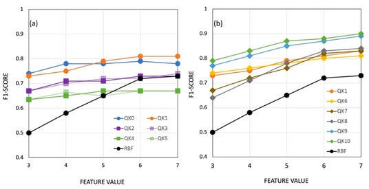 図2:特徴量数とF1スコアの関係。量子カーネル(QK9, QK10)が古典的カーネル(RBF)より高い識別性能を示している。この結果は量子シミュレータでの計算結果である。