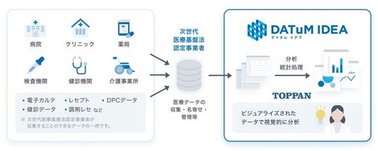 TOPPANホールディングスは「健康・ライフサイエンス」領域を今後の成長領域と定め、次世代医療基盤法(※1)に基づき、匿名加工された電子カルテデータを基にした医療情報分析・提供サービス「DATuM IDEA(R)」を製薬会社およびアカデミア・医療機関に提供しています。