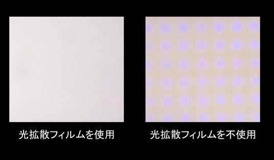 こうした課題に対し、DNPの光拡散フィルムは、拡散板などがなくてもドットの映り込みを低減でき、輝度を落とすことなく、ディスプレイの薄型化や消費電力低減に貢献します。