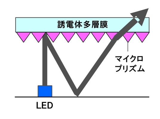 - マイクロプリズムは、LEDの光の方向を制御し、左右に光を拡散させます。光の拡散によって明るさを均一化することで、ドットの映り込みが低減し、光の利用効率も高まります。