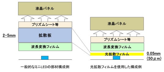 近年、液晶や有機EL(OLED)に続く次世代ディスプレイとして、ミニLEDやマイクロLEDが注目されています。ミニLEDは、直径100~300μm(1μm=0.001mm)ほどのLEDが高密度にパネル基盤に実装されたもので、高い輝度による鮮やかな画質と低消費電力性能が特長です。これらのディスプレイは、一部のテレビやPCなどで利用が始まっており、今後小型電子デバイスにも利用が拡がるなど、世界的に市場拡大が見込まれています*1。一方でミニLEDは、パネル基盤に高密度に配置したLEDの素子(ドット)が、人の目では見えやすいため、拡散板や特殊な印刷パターンを活用して映り込みを減らしていました。その際、厚みのある拡散板を使用すると光の透過率が低く、消費電力量が増えるという課題もありました。