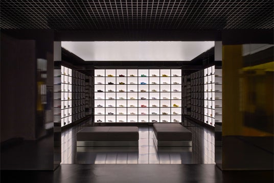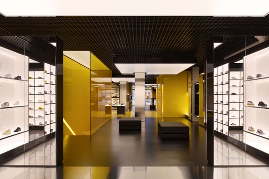 1Fは、Onitsuka Tigerのシグネチャーカラーであるイエローに統一された光沢感のある内装のリテールスペースで、東京の活気に満ちたモダンなエネルギーを彷彿とさせます。光を反射する壁と磨き上げられた床が開放的でダイナミックな空間を演出する一方、洗練された格子模様の天井とライトアップされたパネルが近未来的なタッチを添えます。 自然光が店内に差し込む様子は、グラシア通りに佇むこの壮麗な建築物にオマージュを捧げています。