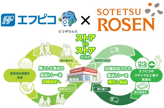 株式会社エフピコ(代表取締役会長:佐藤 守正、以下「エフピコ」)は相鉄ローゼン株式会社(代表取締役社長:曽我 清隆、以下「相鉄ローゼン」)と協働し、神奈川県を中心とした50店舗(2024年12月時点)を対象に、店頭で回収された使用済み食品トレーを新たな食品トレーに生まれ変わらせる「トレーtoトレー」、及び使用済みペットボトルを回収して新たな食品容器に生まれ変わらせる「ボトルto透明容器」を行い、再び店頭で積極的に「エコトレー」「エコAPET」を使用する、水平リサイクル「ストア to ストア」を促進するための協働を強化します。
