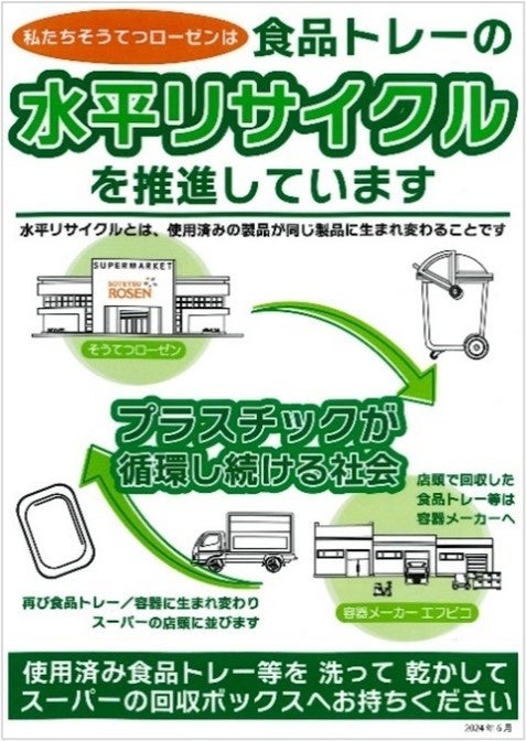 この度の協働強化に伴い、相鉄ローゼンでは「エコトレー」 「エコAPET」の積極的な使用の継続と、新たに「水平リサイクル推進ポスター」を掲出し、お客様に水平リサイクルへの参加促進を図り、周辺地域の皆様と共に持続可能な社会の実現を目指してまいります。