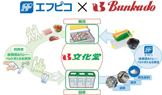 株式会社エフピコ(以下、「エフピコ」)と株式会社文化堂(以下、「文化堂」)は協働し、東京都内と神奈川県内の20店舗を対象に、文化堂店頭にて回収された使用済み食品トレー及び使用済みペットボトルをエフピコが資源化し、新たな食品トレー・透明容器に生まれ変わらせる「トレーtoトレー」「ボトルto透明容器」を行い、再び文化堂店頭で積極的に「エコトレー」「エコAPET」「エコOPET」を使用する「ストアtoストア」の水平リサイクルを促進する取り組みを、更に拡大いたします。