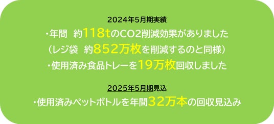 エフピコと文化堂は「お店が地域のエコリーダー」となることを目指し、地域の皆様の使用済み食品トレーやペットボトルを文化堂店舗にお持ちいただき、店頭に設置している回収ボックスにて回収しております。回収した使用済み食品トレー・ペットボトルはすべてエフピコの資源として活用され、これらの回収資源から製造したエコ製品「エコトレー」「エコAPET」「エコOPET」を再び文化堂の売り場で使用することで、CO2の排出抑制に貢献しています。2024年5月期において、使用済み食品トレーを約19万枚回収し、エコ製品を使用することによって、118tのCO2排出抑制に貢献しました。また、2024年7月より使用済みペットボトルの回収を開始し、年間で329,700本の回収見込みとなっております。この度の協働強化に伴い、文化堂は「エコトレー」「エコAPET」「エコOPET」をより積極的に使用することで、2026年5月期において、「年間130t」のCO2排出抑制を目指します。