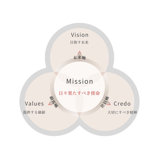 新たな企業理念体系である『KAWAI Philosophy』はKAWAIの価値観や存在意義、目指す方向性を体系的に表したものであり、「Mission(日々果たすべき使命)」、「Vision(目指す未来)」の他、世の中に提供する価値として「Values(提供する価値)」、社員一人ひとりが大切にする行動指針として「Credo(大切にすべき精神)」の4つで構成されています。