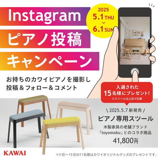 『TY-1』の発売を記念し、2025年5月1日~6月1日に、カワイ公式Instagram(@kawaipianosjapan)で「ピアノ投稿キャンペーン」を開催します。お持ちの当社のピアノを撮影し、投稿・アカウント(@kawaipianosjapan)のフォロー・コメントをしていただくと応募が完了いたします。合計15名の写真を選定し、内4名にはピアノ専用スツール『TY-1』を、内11名には当社オリジナルグッズをプレゼントします。SNSキャンペーンにつきまして下記連絡先へお問い合わせください。お問い合わせ先