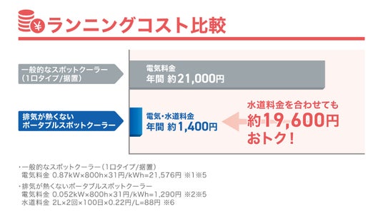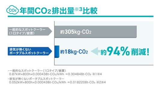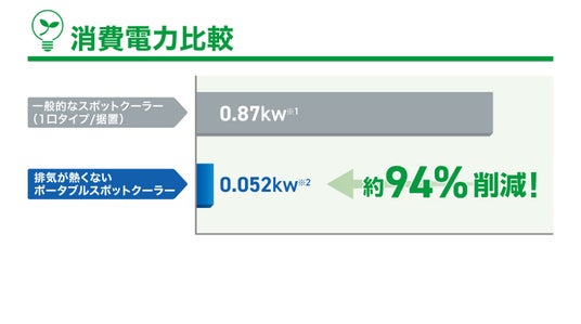 また、一般的なスポットクーラーと比較し、年間CO2排出量は約6%に抑えられ、消費電力は約94%、ランニングコストは年間約19,600円削減できるなど、社会課題の解決にも貢献します。
