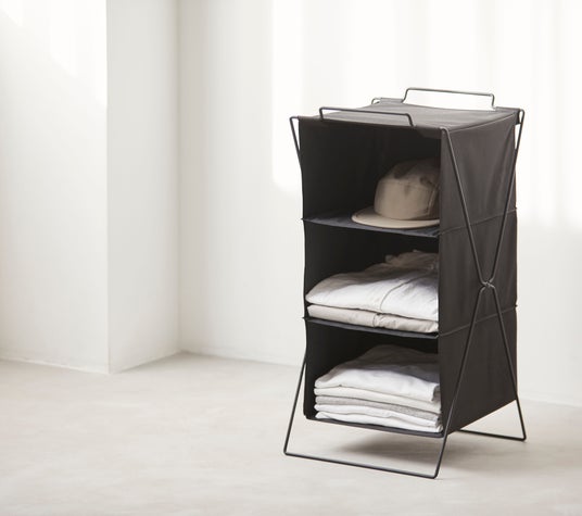 「3段ファブリックシェルフ」はシャツや帽子など種類ごとに分けて衣類を収納することができ、正面から簡単に取り出すことができます。「ボトムスワイヤーラック」は1つで「掛ける、置く、吊るす」の3通りの使い方ができ、ボトムスを掛けて収納することはもちろん、小物を置くなど、お好みに合わせた収納が可能です。「たためるハンガーラック」は洋服をかけて収納でき、取り外し可能な棚板付きで、棚上や棚下にもたっぷり収納できます。