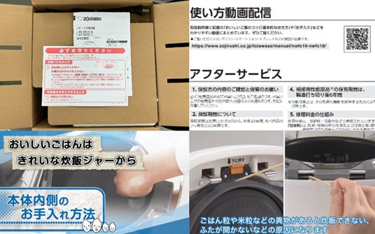 (左上)注意喚起のチラシを同封、(右上)取扱説明書に「使い方動画」へ誘導する二次元コードを掲載、(下)「使い方動画」の一部