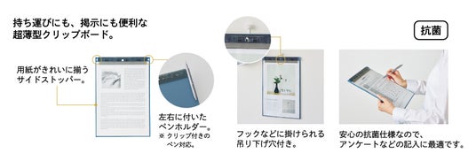 パーソナルにも、オフィスや店舗でも雰囲気にあったカラーをお選びいただけます。今までの超薄型クリップボードの機能はそのまま、クリップの中央部には、掲示にも便利な吊り下げ用フック穴が付き、本体両端にクリップ付きのペンに対応したペンホルダー付きで、左利きのユーザーにも使いやすくなりました。さらに抗菌仕様なのでアンケートなど不特定多数の人が使用する場面でも安心して使える仕様となっています。