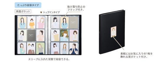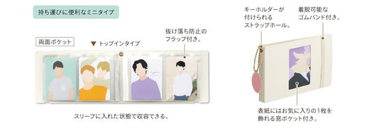 myfaシリーズで好評の「コレクションファイル(A5/A4)」に、ユーザーからの「カバンの中に入れて持ち運びたい」というご要望におこたえし、新たにミニサイズを加え、背幅違いで2種類展開します。持ち歩きやすく本棚に収納しやすいミニサイズで細々した推し活グッズをまとめて保管・収納できるファイルです。既存サイズ同様、ポケット付き表紙には、A6サイズ用紙やポストカードが入れられ、オリジナルの表紙を作れます。また、背表紙にはキーホルダーがつけられるハトメ(穴)付きです。