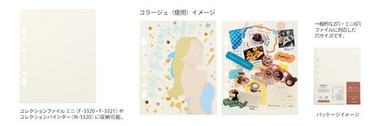 推し活のメモや、コラージュ、カリグラフィーに最適な厚紙タイプのコラージュペーパーリフィルが新登場。新製品のコレクションファイルミニはもちろん、既存品のコレクションバインダー(N-3320)にも収納可能です。一般的な2穴・ミニ6穴ファイルに対応した穴サイズです。