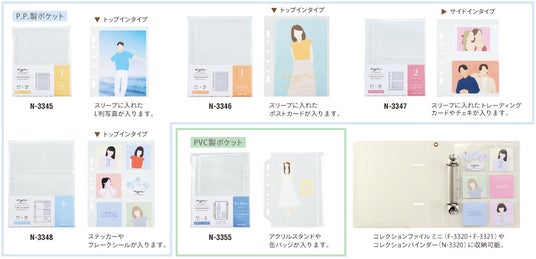 コレクションファイルミニ・ミニワイドに収納できる様々な推し活グッズに対応するクリヤーポケットのミニサイズを追加します。新製品のコレクションファイルミニはもちろん、既存品のコレクションバインダー(N-3320)にも収容可能です。一般的な2穴・ミニ6穴ファイルに対応した穴サイズです。