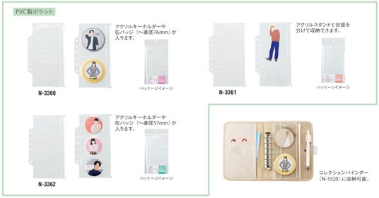 ミニ6穴に対応した、アクリルスタンドや小物など、収容物に合わせて選べる3種類の仕切り付きファスナーポケットリフィルです。既存のコレクションバインダー(N-3320)に入れて、一緒に持ち運びできます。PVC製ですので、アクリルスタンドや缶バッジ等、厚みのあるグッズを収納できます。