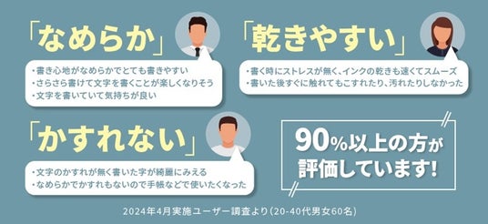 最大の特長である新感覚の“すいすい”とした書き味について、事前調査を行い、多くのユーザー様にとって、価値を感じていただけるインクであることを確認しております。