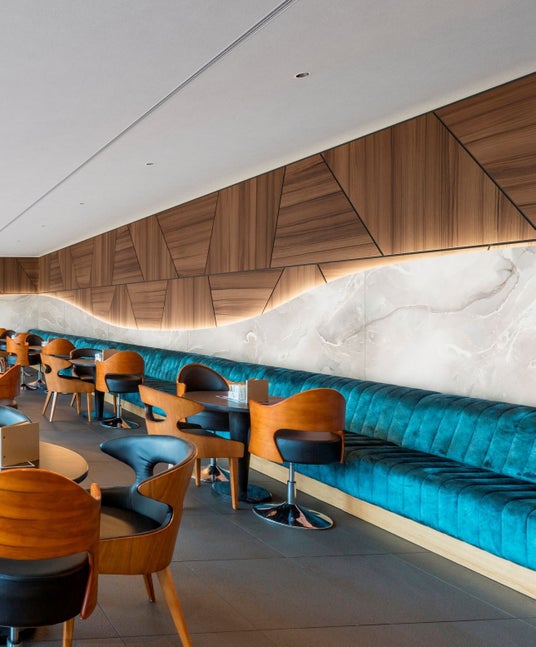 さらに、従来の「エマウォール インテリアタイプ」では、直線的な切断に特化したシャーリングという方法で切断するため、形状が長方形や正方形といった矩形に限られていました。今回新発売の「レーザーカットパネルW」、「レーザーカットパネルS」では、先述のレーザービームによる切断を用いる事により、多角形や円形に加え、自由曲線状にカットすることができるようになりました。異素材や電飾造作と組み合わせられたり、異なる柄のパネル同士で幾何学模様をデザインできたりと、表現力が大きく向上しました。