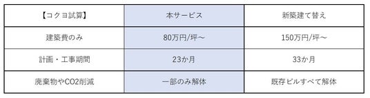 当社試算では、本サービスは新築建て替えと比べて、建築費のみの予算では約半分程度の坪80万円~、また設計・工事期間も約1年程度の短縮が可能です。またそれらからの二酸化炭素の排出量も大幅に削減可能です。