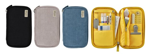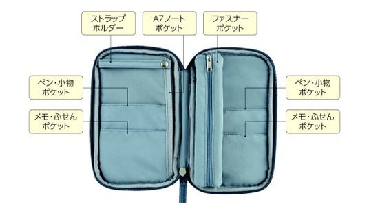 <パンケース>は6つのポケットとストラップホルダーで文具をきれいに仕分けして収容することができます。また、ノートのように開くことができるため、どこに何が入っているのかが一目瞭然で、必要な文具がサッと取り出せます。大小様々なサイズのポケットにはA7サイズのノートやペン、ふせんなどの小物を、ストラップホルダーにはマスキングテープなどを通して収容することができます。また、コンパクトに持ち運べる仕様になっており、厚さは空の状態で3cm程度でありながら、ペンの想定収容本数は約18本です。表面は触り心地のよいコーデュロイ素材で仕上げました。